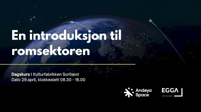 Andøya Space tilbyr, i samarbeid med Egga Utvikling, et dagskurs som gir deltakerne en introduksjon til romsektoren, med vekt på dens økende betydning for Norges fremtidige samfunns- og næringsutvikling. Dette kurset er spesielt tilpasset til dere som har liten/ingen innsikt i romsektoren, og som ønsker å få vite mer om hva som kjennetegner en mer og mer viktig sektor for Norge og Nord-Norge.